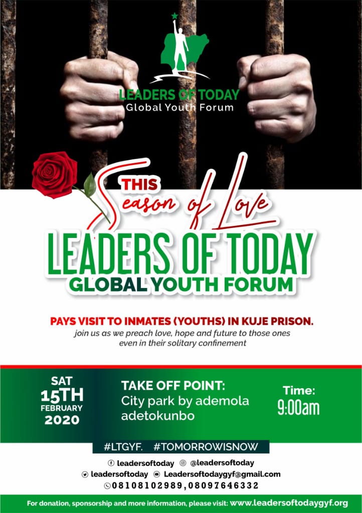 As Leaders of Today Global Youth Forum embark on the journey to restore the trust and confidence on our Youths through our set out aims and objectives, these ones in the solitary confinement, if left behind, might jeopardise our efforts when they are re-integrated back into our folds. As a result, we are set out to reach out to the Youths incarcerated in Kuje prisons this season of Love, do well to support.